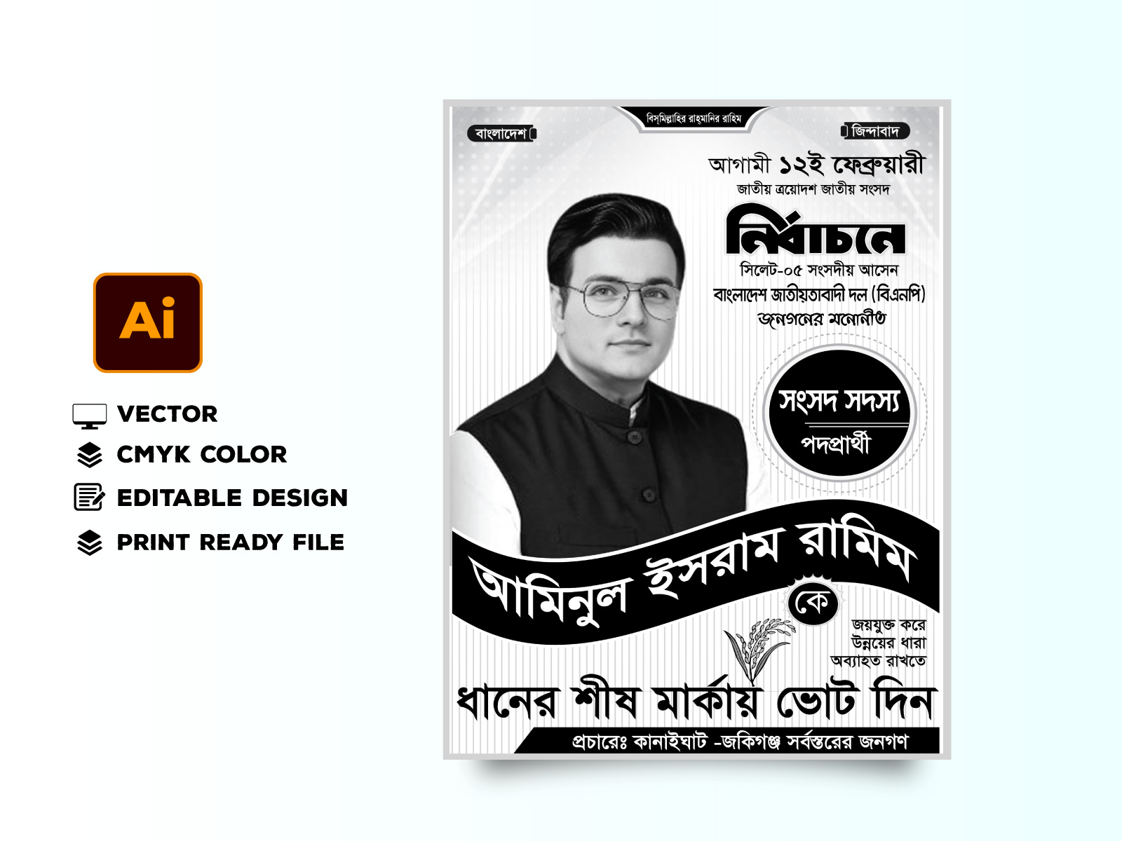 এই ডিজাইনটি “বিএনপি মনোনীত সংসদ সদস্য পদপ্রার্থী পোস্টার ডিজাইন 2026” তৈরি করা হয়েছে গ্রাফিক্স ডিজাইনের জনপ্রিয় ব্যবহারকৃত মাধ্যম Adobe Illustrator দিয়ে। এই ডিজাইনটির ল্যায়ার গুলা সুন্দর করে গ্রুপ ভিত্তিক সাজানো হয়েছে। আপনি খুব সহজে নিজের মতো করে ব্যবহার করতে পারবেন এবং এডিট করতে পারবেন। এছাড়াও আপনি ডিজাইনটি প্রিন্ট করতে পারবেন।