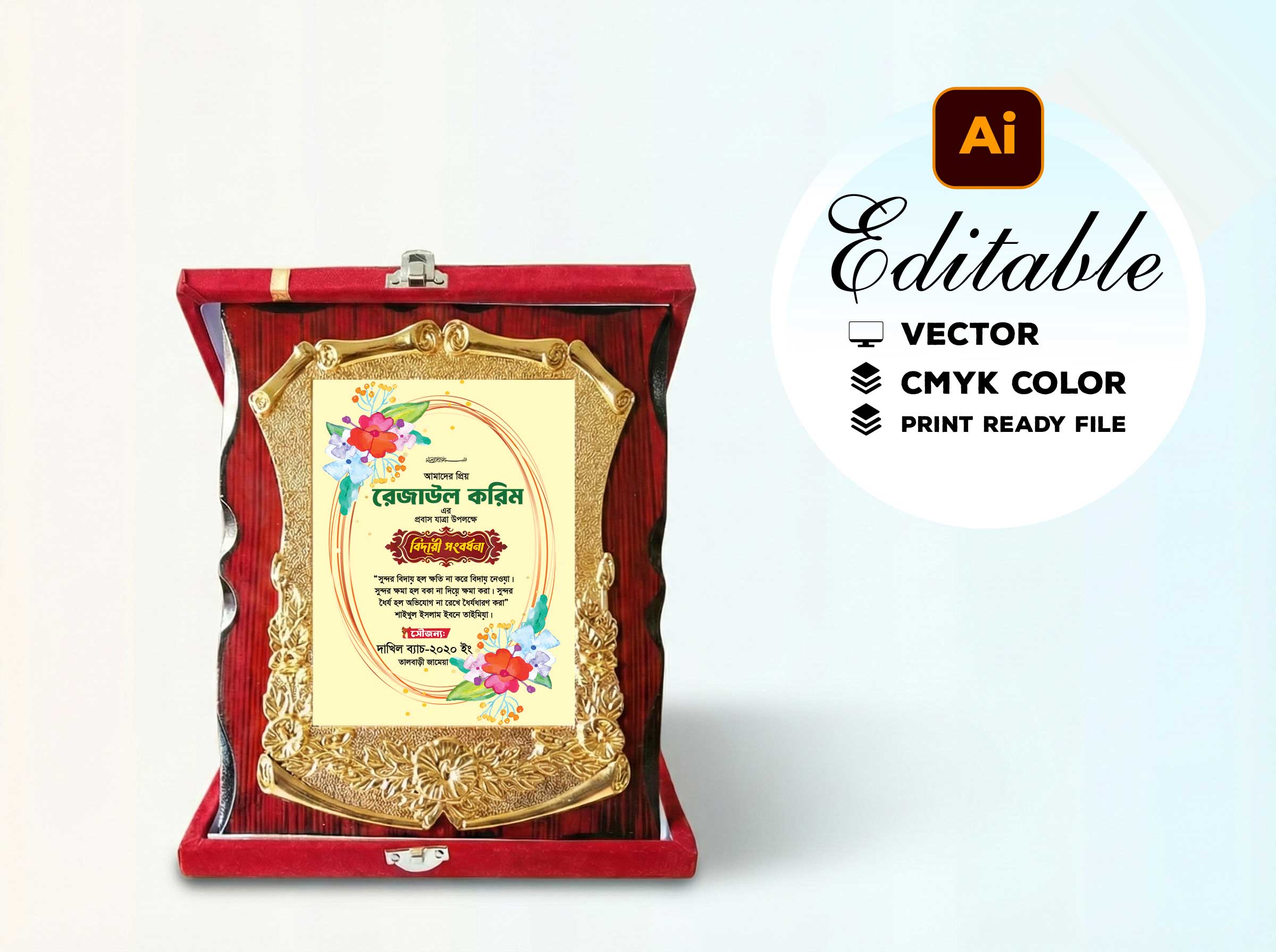 এই ডিজাইনটি “প্রবাস গমন বিদায়ী সংবর্ধনা ক্রেস্ট স্মারক ডিজাইন” তৈরি করা হয়েছে গ্রাফিক্স ডিজাইনের জনপ্রিয় ব্যবহারকৃত মাধ্যম Adobe Illustrator দিয়ে। এই ডিজাইনটির ল্যায়ার গুলা সুন্দর করে গ্রুপ ভিত্তিক সাজানো হয়েছে। আপনি খুব সহজে নিজের মতো করে ব্যবহার করতে পারবেন এবং এডিট করতে পারবেন। এছাড়াও আপনি ডিজাইনটি প্রিন্ট করতে পারবেন।