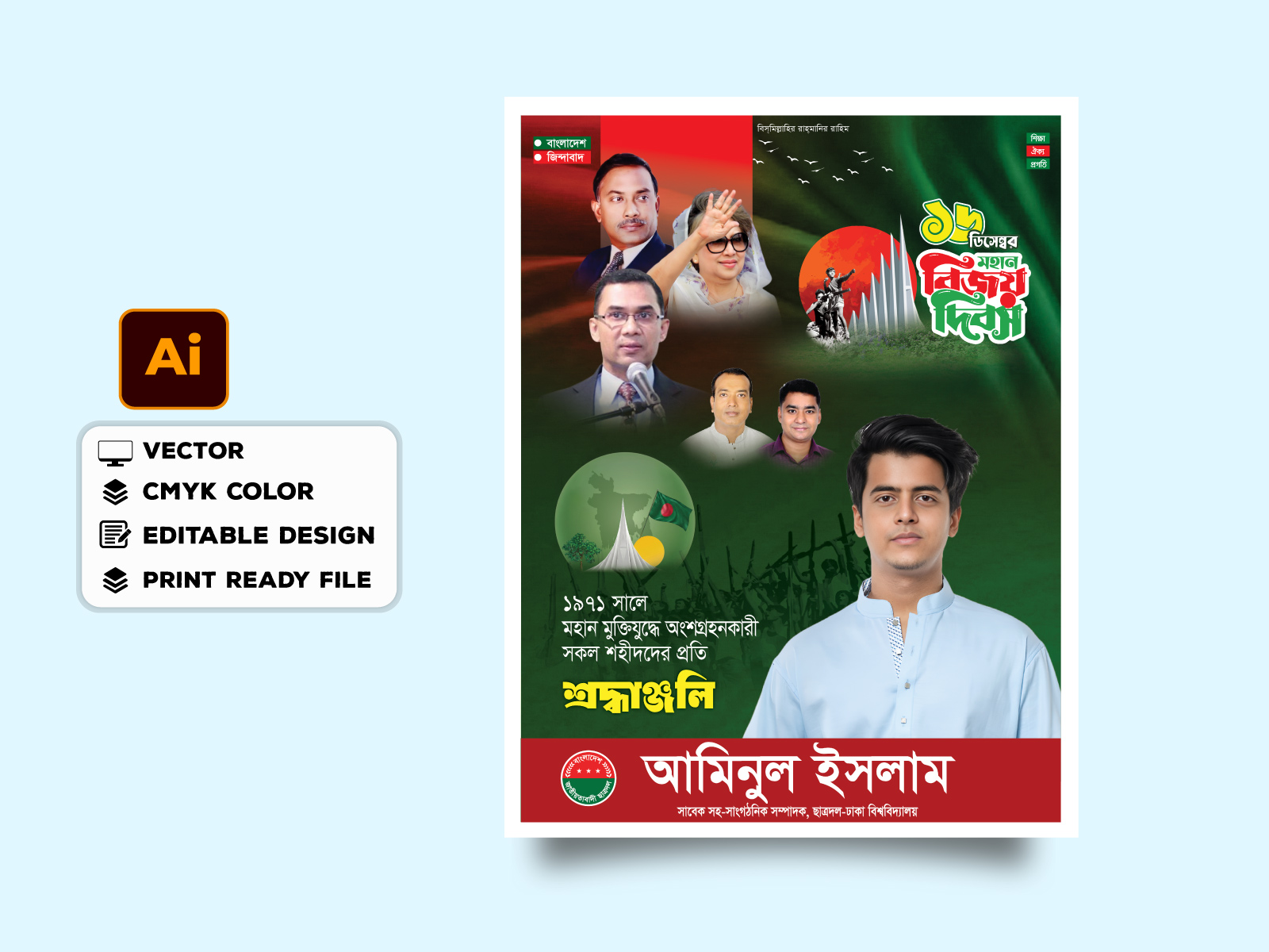এই ডিজাইনটি “16 December Bijoy Dibosh Banner/১৬ ডিসেম্বর বিজয় দিবস ব্যানার ডিজাইন ২০২৫” তৈরি করা হয়েছে গ্রাফিক্স ডিজাইনের জনপ্রিয় ব্যবহারকৃত মাধ্যম Adobe Illustrator দিয়ে। এই ডিজাইনটির ল্যায়ার গুলা সুন্দর করে গ্রুপ ভিত্তিক সাজানো হয়েছে। আপনি খুব সহজে নিজের মতো করে ব্যবহার করতে পারবেন এবং এডিট করতে পারবেন। এছাড়াও আপনি ডিজাইনটি প্রিন্ট করতে পারবেন।